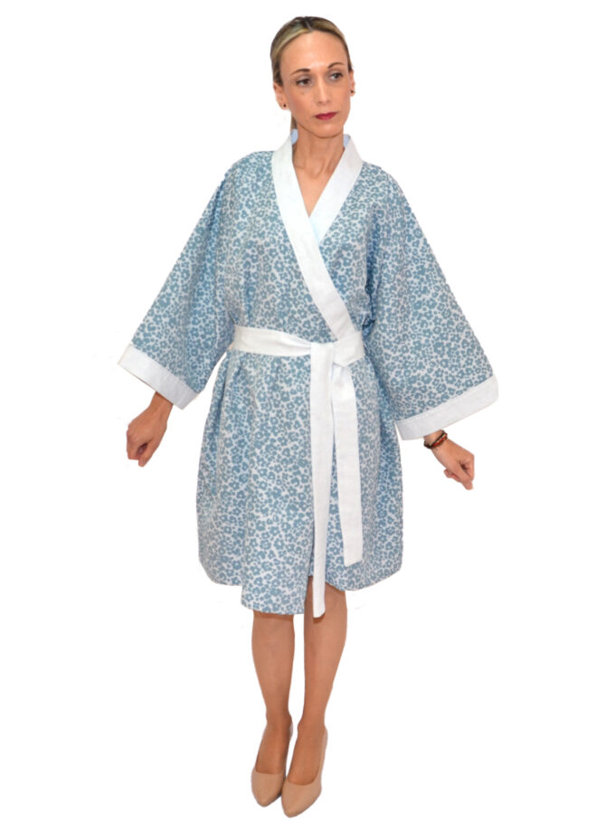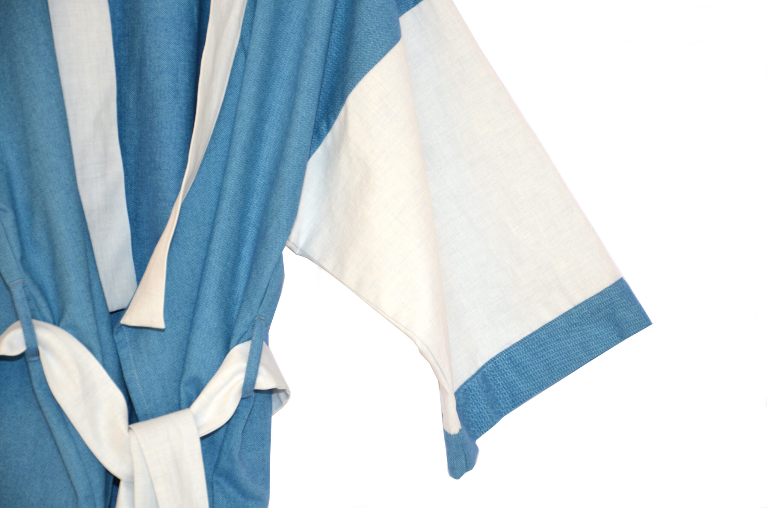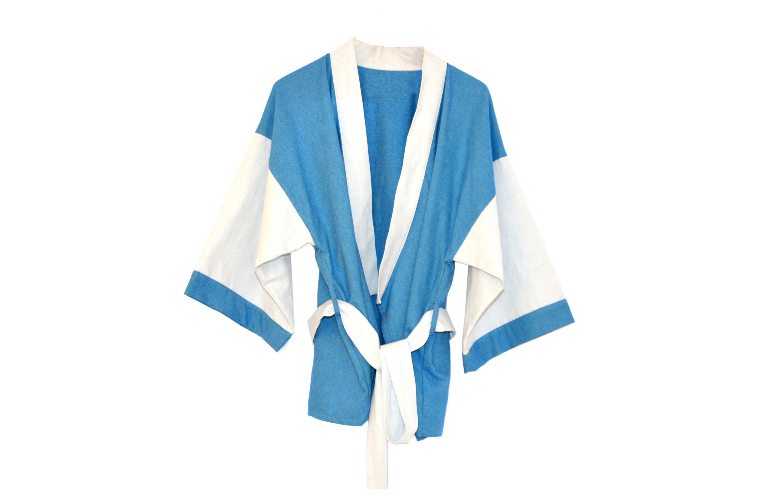 Si el azul es tu color, no te podrás resistir a este modelo muy versátil y cómodo. Kimono confeccionado, a mano, con loneta. Se aconseja su lavado a máquina, en frío.