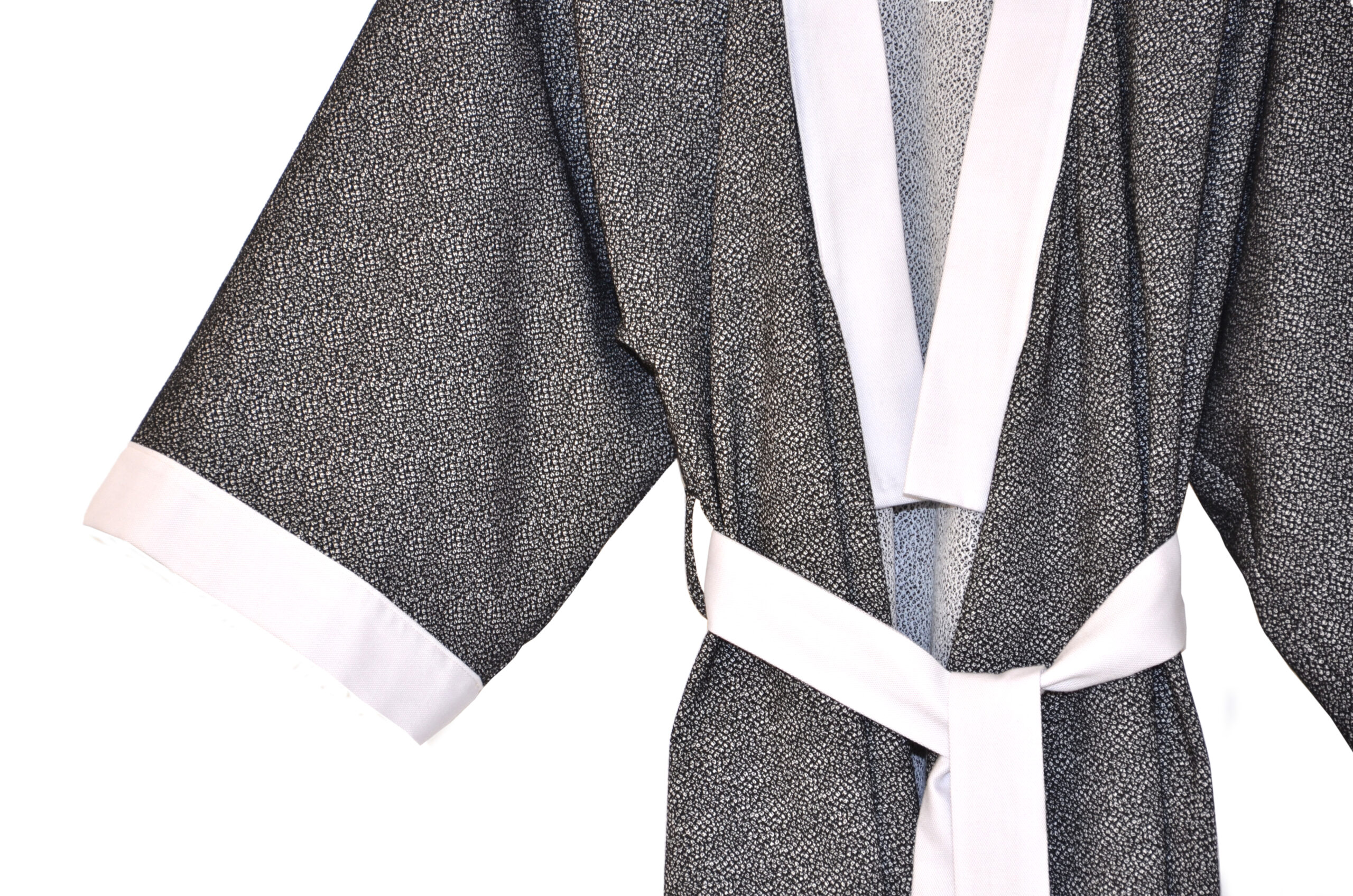 Elegante y original. El relieve de este brocado en negro convierte a la prenda en una opción muy especial para cualquier ocasión y momento del día. El contraste con las vistas en blanco equilibra el look. Kimono confeccionado a mano. Se aconseja su lavado manual y en frío.
