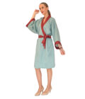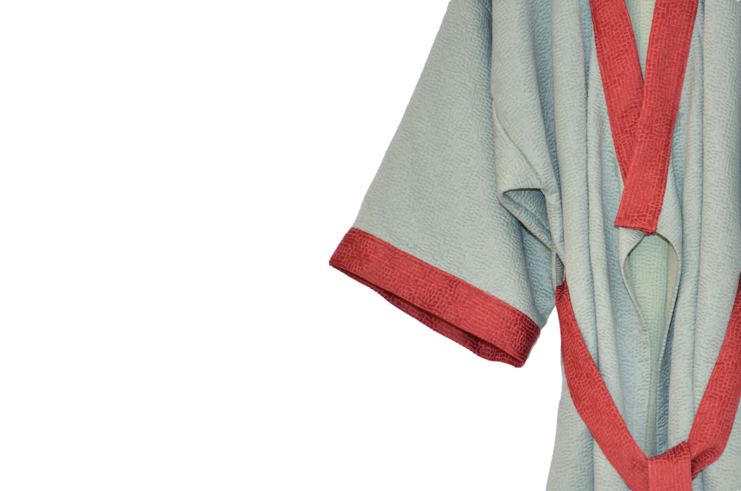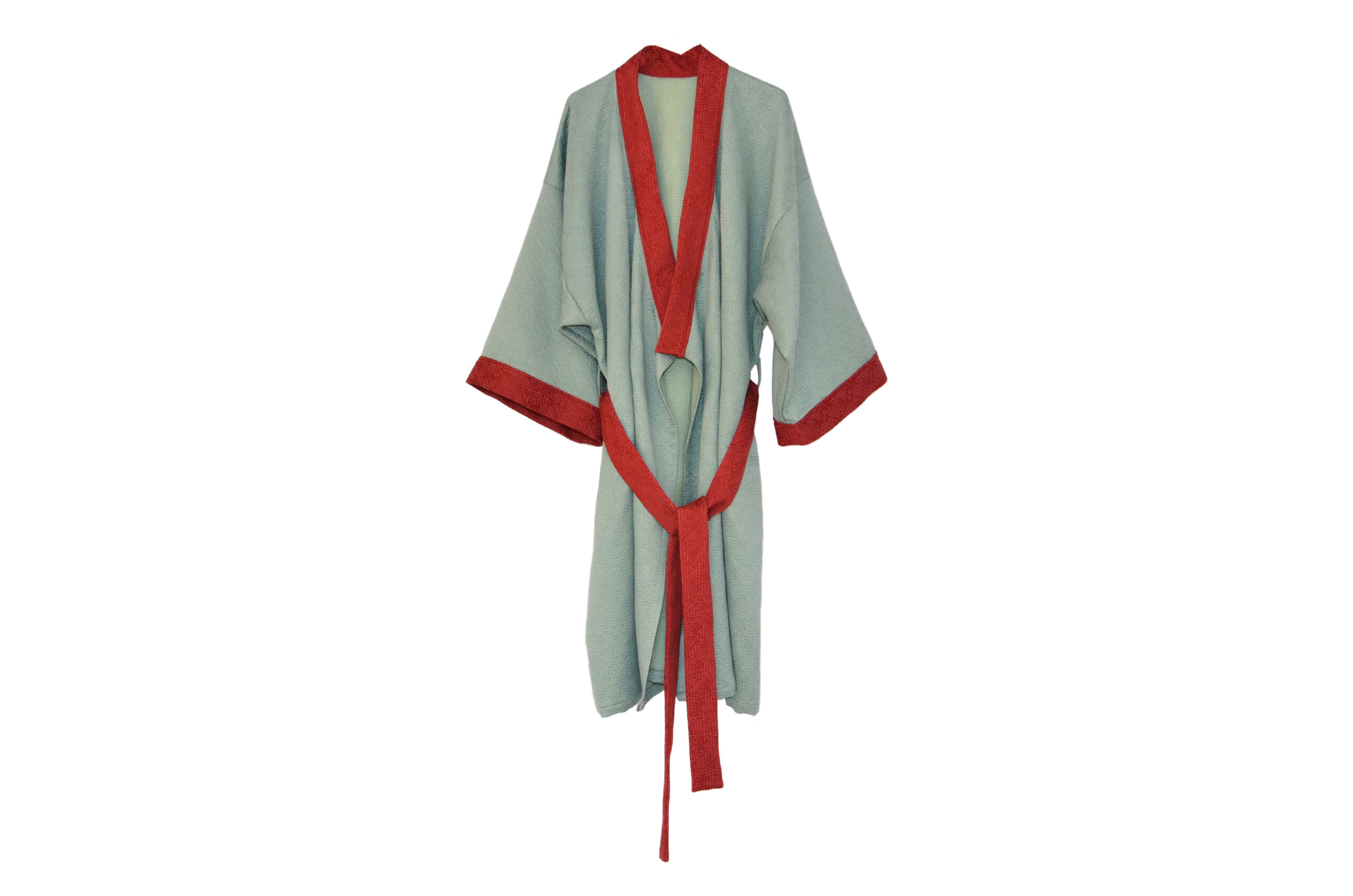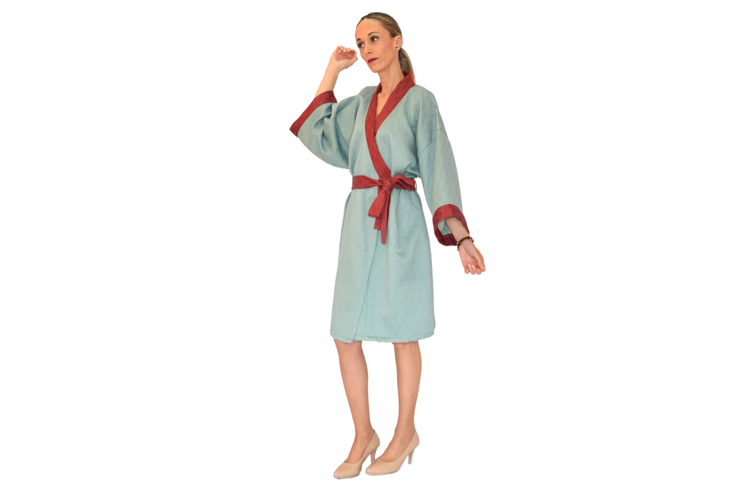 Una prenda poderosa, creada a partir de la maestría de su tejido. Con cuerpo y con una elegante trama en relieve, este diseño es imprescindible como fondo de armario. En granate y verde aguamarina, también está disponible en la combinación inversa. Kimono confeccionado a mano. Se aconseja su lavado a mano, en frío.