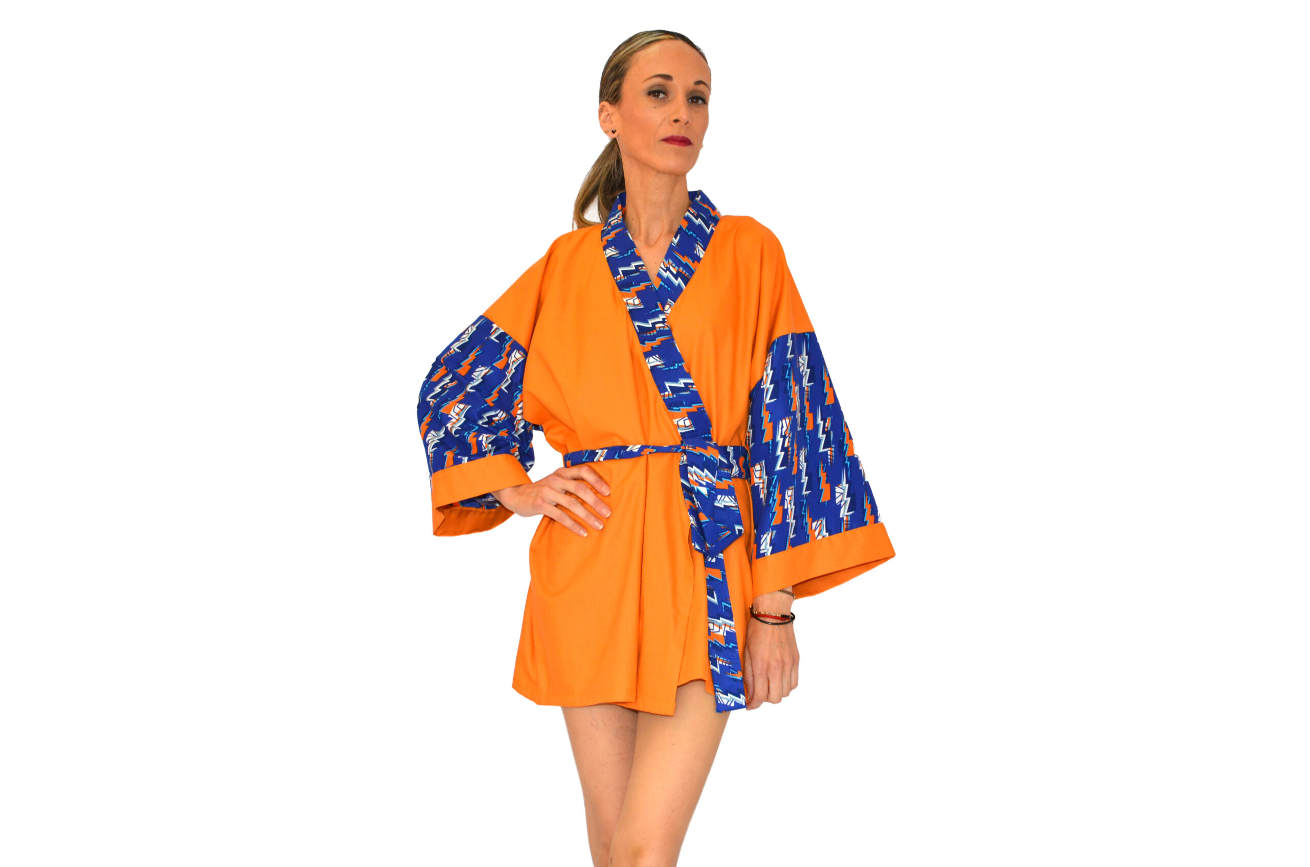 Porque en la vida hay que arriesgar, atrévete con este diseño divertido que combina el color del momento, el naranja, con un estampado muy retro. Kimono confeccionado a mano en loneta. Se aconseja su lavado a máquina, en frío.