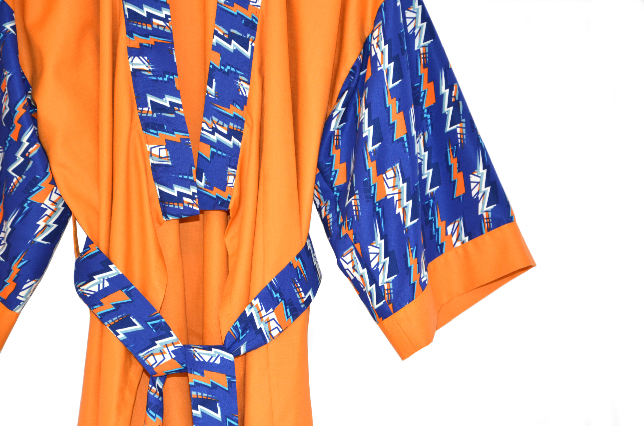 Kimono confeccionado en loneta, combinando el color tendencia, el naranja, con un estampado muy original
