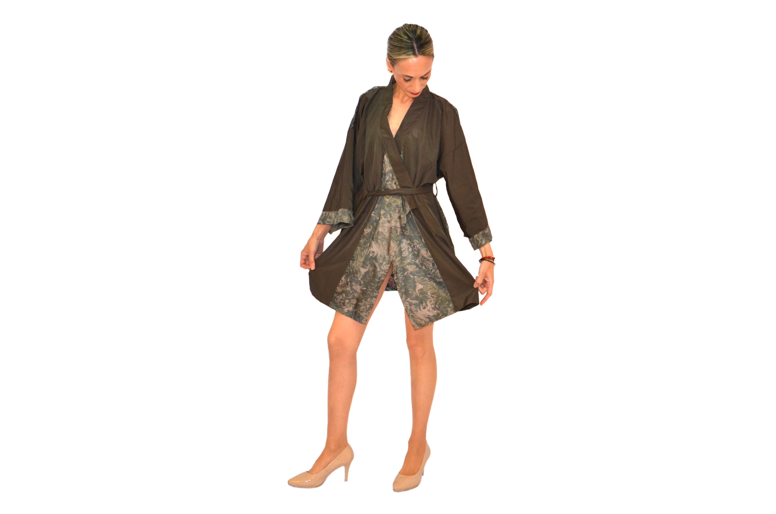 Sobrio por delante y atrevido en la retaguardia. Este modelo reúne todo para convertirse en un imprescindible en cualquier closet. Kimono confeccionado, a mano, a partir de tejido impermeable. Se aconseja su lavado a mano, en frío. No usar plancha.